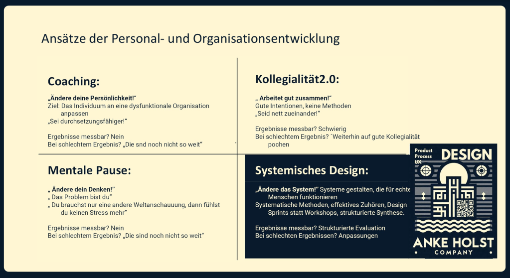 Meine Arbeit ist qualitativ ganz klar besser als die der Prozessmanager, die dafür angeheuert wurden. Jetzt steht also die Skalierung an und ich habe einen Grund dafür, mich mit den Mitarbeitenden in Verbindung zu setzen, die Führungskräfte-Training beauftragen. Ich habe das bestehende Führungskräfte-Training und einige Grundsätze, die von den Führungskräften der Organisation verkündet wurden, analysiert. Und ich sehe nur „seid gute Kollegen“ und „arbeitet gut zusammen“ – keine Methoden, keine Werkzeuge.