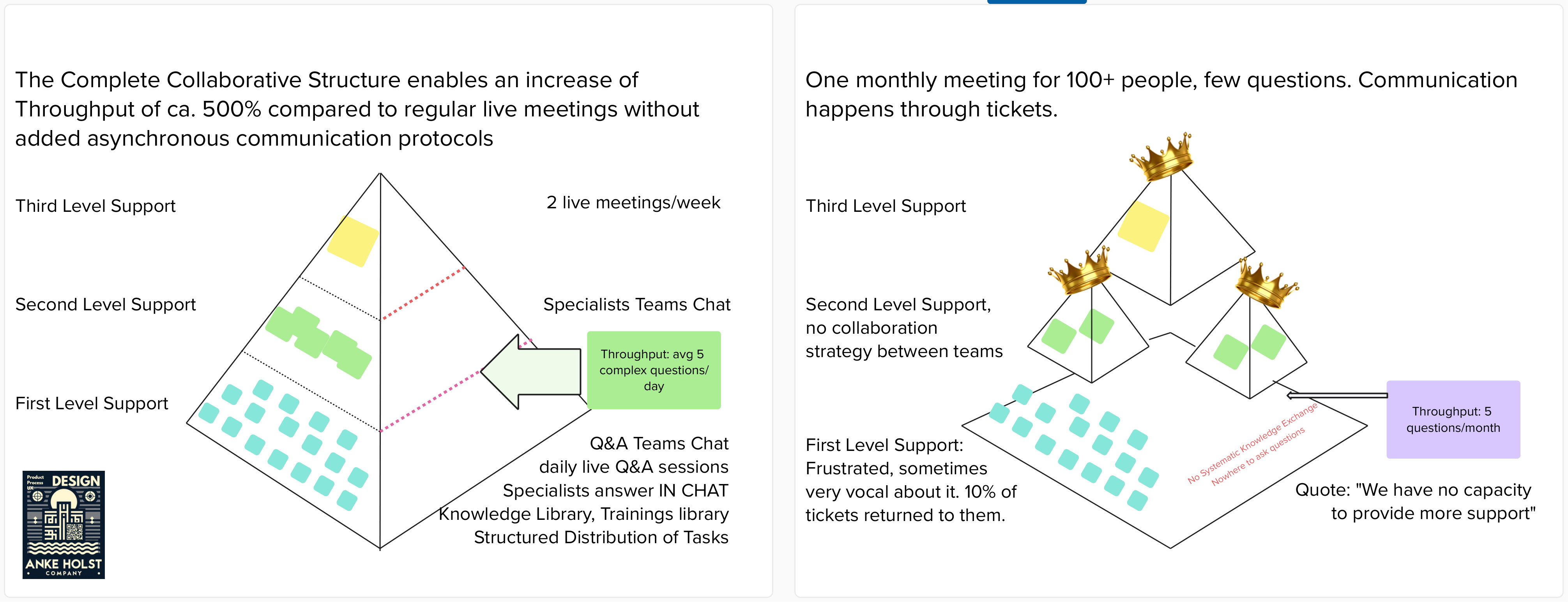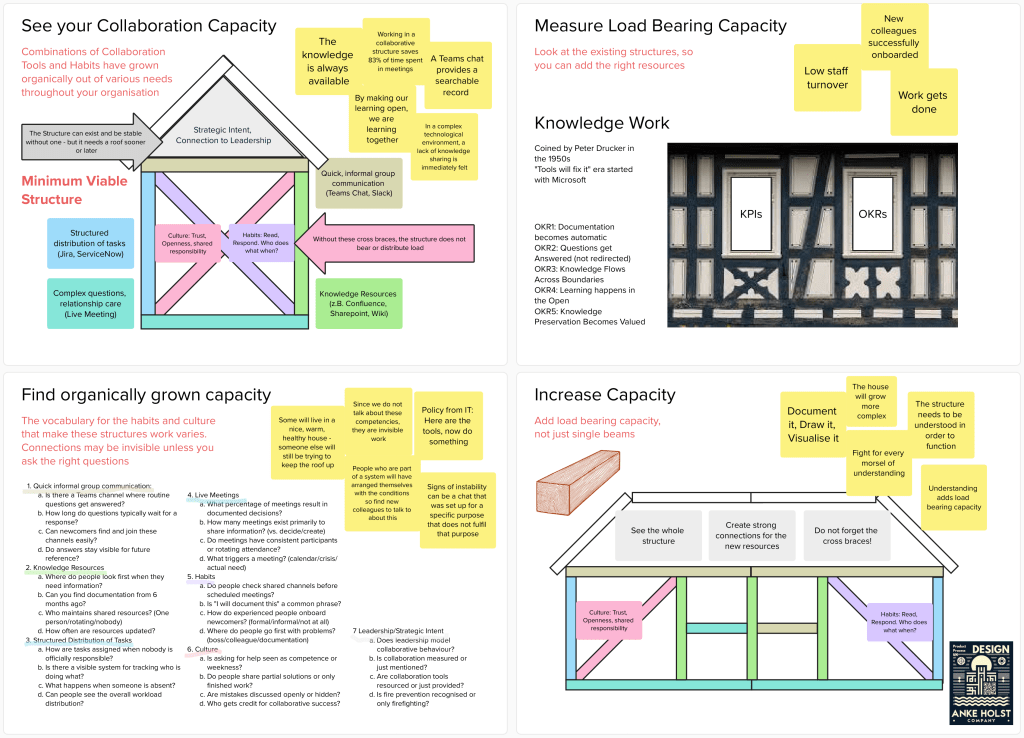 Ich habe diese Woche geschafft, ein Visual zu erstellen – eigentlich zwei, ein zweites als Kontrast – das in eine Präsentation eingeflossen ist, die nächste Woche in sehr großer Runde präsentiert wird. In der die zusätzlichen Kapazitäten, die wir durch die Nutzung unserer Tools zum effektiven Zusammenspiel erreichen, messbar dargestellt wird. Das Konstrukt sieht total sinnvoll aus, ja klar funktionieren die Dinge so – bis wir es mit der „normalen“ Arbeitsweise in Kontrast setzen.