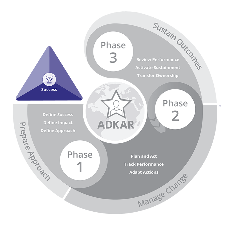 Prosci ist das weltweit meistverkaufte Change-Management-Framework. Es basiert auf dem ADKAR-Modell: Awareness, Desire, Knowledge, Ability, Reinforcement. Fünf Stufen, durch die Einzelpersonen geführt werden, damit sie eine vorgegebene Veränderung annehmen.